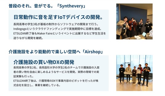 参加者チームの中には、実施後にプロジェクトの事業化や法人化に進んだケースも複数報告されており、起業者が6名、2チーム誕生しました。ETSUZANは若手ITクリエータ育成の仕組みとしてのみならず、創業率・継続率の高さから、地方におけるスタートアップ支援として全国的にも特筆すべきものとなっています。