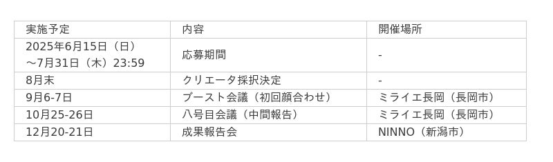 ETSUZANは、NINNO(新潟市)を中心としたスタートアップコミュニティや、大学・教育機関が集積する長岡地域など、新潟県内の多様なエコシステムと連携しながら実施されます。県内全域を対象に、若手クリエータの挑戦を支え、地域横断的なネットワークと起業家精神の醸成を目指しています。