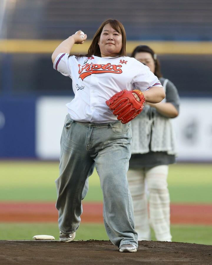 始球式を務めた、吉本新潟住みます芸人のチカコホンマさん=6月18日、エコスタ