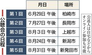 東京電力柏崎刈羽原発柏崎市、刈羽村にある原子力発電所で、東京電力が運営する。1号機から7号機まで七つの原子炉がある。最も古い1号機は、1985年に営業運転を始めた。総出力は世界最大級の約821万キロワット。発電された電気は主に関東方面に送られる。2012年3月に6号機が停止してから、全ての原子炉の停止状態が続いている。東電が原発を再稼働させるには、原子力規制委員会の審査を通る必要がある。7号機は2020年に、6号機は2025年に全ての審査に「合格」した。7号機は2024年6月に技術的には再稼働できる状況が整った。の再稼働東京電力福島第1原発事故を踏まえ、国は原発の新規制基準をつくり、原子力規制委員会が原発の重大事故対策などを審査する。基準に適合していれば合格証に当たる審査書を決定し、再稼働の条件が整う。法律上の根拠はないが、地元の自治体の同意も再稼働に必要とされる。新潟県、柏崎市、刈羽村は県と立地2市村が「同意」する地元の範囲だとしている。の是非を巡り、県が行う公聴会の在り方が議論を呼んでいる。幅広い意見を聞くため、県は当初、非公開で音声のみを配信するとしていたが、報道各社の批判を受けて方針を変更。公述人が了承すれば映像も配信する。公聴会は花角英世知事が再稼働の是非を判断する上で材料の一つになるため関心は高い。プライバシーに配慮しつつ、県行政の透明性をどう確保するのか。県の対応が注目されている。