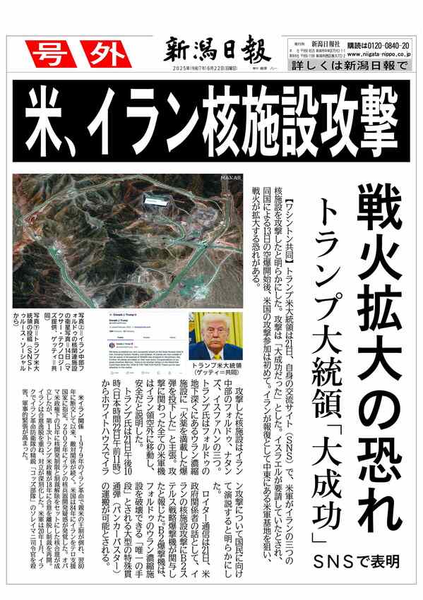 【号外】米、イラン核施設攻撃 2025/6/22 11:00 (最終更新: 2025/6/22 11:04) PDFで号外を見る トップページで最新情報を見る 関連ニュース 【号外】新潟県知事が柏崎刈羽原発再稼働を容認 11/21 【号外】日経平均初の5万円台 10/27 【号外】新首相に高市早苗氏、女性で初めて選出 10/21 【号外】燕市の新市長に前市議の佐野大輔氏 10/20 【号外】北信越高校野球・帝京長岡が優勝 10/19 【号外】公明党が連立政権離脱へ 10/10 【号外】ガザ全人質解放へ 10/9 【号外】ノーベル化学賞に北川進京都大特別教授 10/8 ノーベル化学賞に京都大特別教授の北川進氏ら 10/8 【号外】ノーベル生理学・医学賞に大阪大栄誉教授の坂口志文氏ら3氏 10/6 【号外】自民党新総裁に高市早苗氏 10/4 【号外】石破茂首相が辞任の意向 9/7