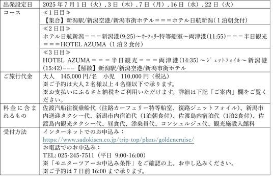 佐渡汽船株式会社(所在地:新潟県佐渡市、代表取締役: 尾渡英生、以下「佐渡汽船」)は、新潟市内発着のハイクラス向けツアー「ゴールデンクルーズin佐渡」モニターツアーの販売を開始しました。