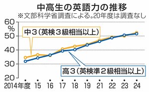 社会 新潟市 新潟市、中3「英検3級以上」34・5%で全国最下位…公立学校対象の英語力調査、全国は52・4% 2025/6/24 5:00 (最終更新: 2025/6/24 8:58) 文部科学省は23日、全国の公立学校を対象にした2024年度英語教育実施状況調査の結果を公表した。中3で英検3級相当以上の英語力がある生徒は前年度より2・4ポイント増の52・4%、高3で英検準2級相当以上は... 残り1114文字(全文:1217文字) ここから先を読むには 続きを読む(会員登録する) 続きを読む(ログイン) 新潟日報朝刊を購読していますか? はい いいえ トップページで最新情報を見る 関連ニュース クマとみられる足跡、三条市の事業所で玄関ドアガラス割られる 11/4 女子中学生にわいせつ行為し撮影疑い 新潟市立中教諭3回目逮捕 11/4 阿賀野市倉庫にクマ立てこもり、安全優先で麻酔銃使用 資格者待... 11/4 護衛艦「みょうこう」、クマ出没情報のため、新潟東港での公開イ... 11/4 新潟市水道局が上下水道の使用料を誤徴収 14年間で103万円 11/4 特殊詐欺電話の「かけ子」勧誘疑い 広島市の男を再逮捕 11/4 草刈り作業中に石が飛び中学生けが 魚沼市が60代職員を戒告処分 11/4 上越市で納屋全焼、けが人なし 11/4 「新潟国際アニメーション映画祭」が正念場、運営主軸が名古屋に... 11/4 満足度の高い「高校受験の塾」新潟県ランキングを発表!個別指導... 11/4 ビニールハウスや車…避難所以外で生活送る被災者への支援強化 ... 11/4 [クマ目撃情報]新発田市、五泉市、阿賀町、村上市、魚沼市、南... 11/4