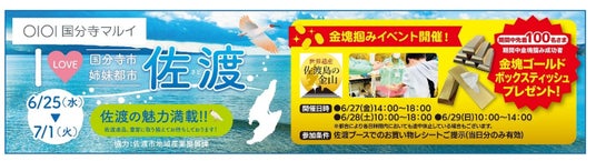 「I LOVE 国分寺」では、佐渡の魅力が満載された、特産品を豊富に取り揃えました。また、当日、佐渡ブースでお買上げのお客さまは、『金塊掴みイベント』にご参加いただけます。金塊掴み成功者の先着100名さまには「金塊ゴールドボックスティッシュ」をプレゼント!