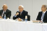 会見に臨む東京電力の福田俊彦原子力・立地本部長(中央左)、柿澤幸彦新潟本社代表(同右)ら=24日、新潟市中央区