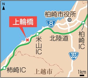 国土交通省長岡国道事務所は26日、柏崎市の国道8号の上輪(あげわ)橋で損傷が見つかり、橋の周辺で実施している通行止めについて、7月中旬までに解除できる見込みになったと発表した。