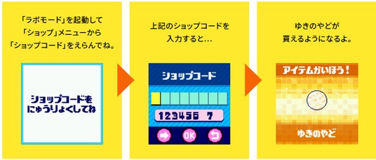 「Tamagotchi Paradise」内のショップにてショップコードを入力すると、「ゆきのやど」がアイテムとして開放されます。「Tamagotchi Paradise」をご購入された際は、ぜひ「ゆきのやど」をショップ内でゲットしてください。