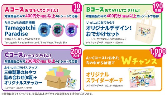 キャンペーン期間中にキャンペーン対象商品を指定金額分(税込)以上お買い上げいただいたレシートを添え、「いつの時代もおやつでごきげんキャンペーン」特設サイト内のWEB応募フォームもしくは専用応募はがき・郵便はがきよりご応募いただくと、抽選で合計1,400名様に本キャンペーン限定のオリジナルコラボグッズや三幸製菓のおやつ詰め合わせなどが当たります。
