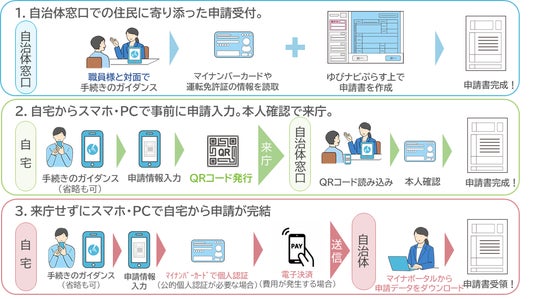 「ゆびナビぷらす」は、『柔軟性』『住民満足』『低コスト』の3つを兼ね備えた窓口改革のためのソリューションです。窓口業務を行う自治体職員の応対時間を減らす「ガイダンス機能」や、住民の入力負担を減らしつつ自治体職員へ正しく申請情報を届ける「申請入力機能」等、多数の機能を揃えています。