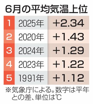 社会 気象 6月は「異常な高温だった」平均気温が過去最高、平年より2・34度高く 新潟県内は22地点で記録更新 2025/7/1 21:45 気象庁は1日、6月の日本の平均気温は平年より2・34度高く、1898年の統計開始以降で最高だったと発表した。これまでの記録だった2020年(プラス1・43度)を大きく上回り、担当者は「異常な高温だった」との... 残り682文字(全文:786文字) この記事を読むには 会員登録が必要です 無料で会員登録して続きを読む 会員の方はこちら(ログイン) 会員のご案内 レギュラープラン【おすすめ】 すべての記事と紙面ビューアー(電子版)を無制限にお読みいただけます。 月額3,300円(税込み)。 新聞を購読されている方は無料です。 ライトプラン 無料記事と有料記事(レギュラープラン限定記事を除く)を月50本までお読みいただけます。 月額1,650円(税込み)。 無料会員 無料記事と有料記事を月2本までお読みいただけます。 無料で会員登録して続きを読む トップページで最新情報を見る 関連ニュース [新潟県の天気・気象情報]上越に竜巻注意情報(10月27日) 10/27 [新潟県の天気・気象情報]10月28日夜遅くにかけて突風や強... 10/27 [新潟県の天気・気象情報]11月4日ごろから高温に注意、この... 10/27 [新潟県の天気・気象情報]気温は高く、日照時間と降水量は平年... 10/24 [新潟県の天気・気象情報]気温平年並みか高い見込み、11月は... 10/21 傘を持って出かけるかの判断材料…「降水確率」ってそもそも何?... 10/20 [新潟県の天気・気象情報]19日明け方にかけ、土砂災害や河川... 10/18 [新潟県の天気・気象情報]10月19日にかけて雷や激しい雨降... 10/17 [新潟県の天気・気象情報]10月16日は県内警報級の大雨の可... 10/15 台風シーズン10月以降も続く恐れ…高い海水温、偏西風蛇行 列... 10/13 [新潟県の天気・気象情報]気温は高く、日照時間は平年並みか少... 10/11 【ヒートマップ付き】記録的猛暑となった今夏…色分けで可視化す... 10/8 特集・連載 県内でインフルエンザが流行期入り、昨年より約3週間早い 魚沼... 10/30 【高校入試・新潟】最新情報&お役立ち情報まとめ 倍率・過去問も 7/28 漫画で知る「うつ病」とは? 若手社員が休職→通院→復職するま... 6/13 [紅葉スポット×花スポット]新潟県内の紅葉や花畑、映える名所... 5/29 【猫動画・新作あり】新潟県内「猫のいる店」♡モフモフに触れる... 10/29 [WEリーグ]今からでも間に合う!アルビレックス新潟レディー... 8/14 【機動戦士ガンダムジークアクス】鶴巻和哉監督(五泉市出身)が... 8/4 [プロ野球ドラフト会議]プロ志望届、新潟県関係は7人が提出!... 10/9 [新潟県の地域別感染症情報]マイコプラズマ肺炎、インフルエン... 10/23 Otona+ 今や「1兆円市場」冷凍食品はなぜ愛されるのか?県民に人気の商... 10/28 【動画あり】新潟の夜空染めたオーロラ、実は江戸時代にも目撃さ... 10/21 卵子提供で2児出産、自助グループ立ち上げ当事者に寄り添い…芸... 10/14 山頂に神社、小学校の屋上…各地に点在する「三角点」って?形は... 9/30 「アクシアル」「コメリ」などプライベートブランド開発の裏側お... 9/23