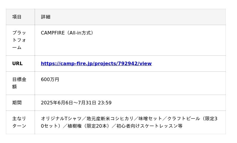 - 施設整備に向け、現在CAMPFIREにてクラウドファンディングを実施中(目標600万円/7月31日まで)さらなる支援と情報拡散を呼びかけ中です。
