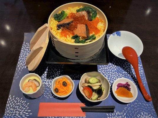 ●「わっぱ飯」は、新潟県と福島県会津地方の郷土料理で、薄い木の板を曲げて作った「わっぱ」にご飯と具材を詰め、蒸して作る米料理です。薄口の出汁でご飯を炊き上げ、鮭やイクラなどの多彩な食材とともにわっぱにのせて蒸し上げます。● わっぱ飯は冷めてもご飯がふっくらとしており美味しくいただけますが、当店では、お客様お一人ごとに卓上コンロに乗せて提供することで熱々のわっぱ飯をお召し上がりいただけます。