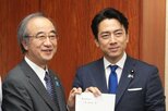 小泉進次郎農相(右)にコメの安定供給を要請する全国包装米飯協会の佐藤元会長=8日、農林水産省