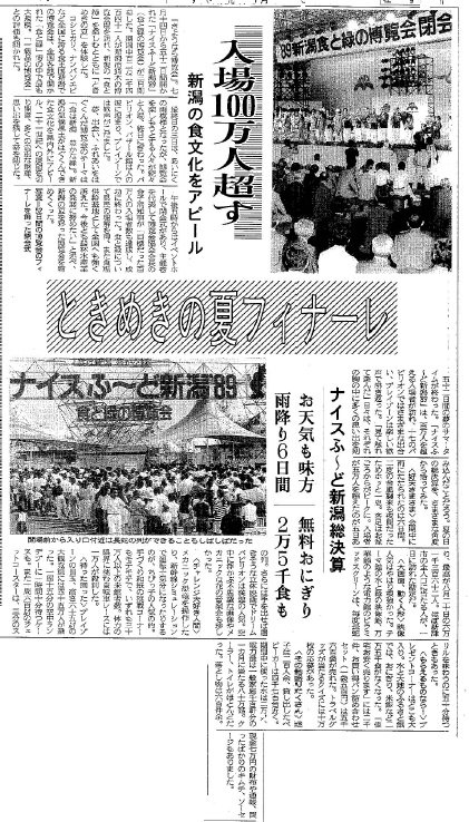 「ナイスふ~ど新潟は」1989年7月14日~9月3日、新潟市で開かれました。会場は「新潟市産業振興センター」(中央区鐘木)周辺です。沼地状態だった市有地を整地するなどし、会場が造成されました。