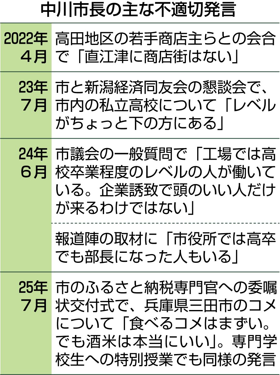 中川市長を巡っては、2022年4月に「直江津に商店街はない」と発言。23年7月には、市内の私立高校について「レベルがちょっと下の方にある」と述べるなど、これまで不適切発言を繰り返していた。
