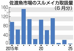 スルメイカは回遊魚で5月下旬〜8月ごろに多く取れる。佐渡魚市場の取扱量(6月分)の推移は、2020年、22年は100トンを超えたが、23年は異例の不漁となり約5・2トンを記録。今年は23年を下回る事態となった。