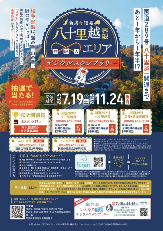 福島県只見町と新潟県三条市を結ぶ国道289号「八十里越」が、令和8年秋から令和9年夏までの間に開通する予定です。この「八十里越」開通を多くの方に知っていただけるよう、福島と新潟の振興局合同により、下記のデジタルスタンプラリーを開催します。