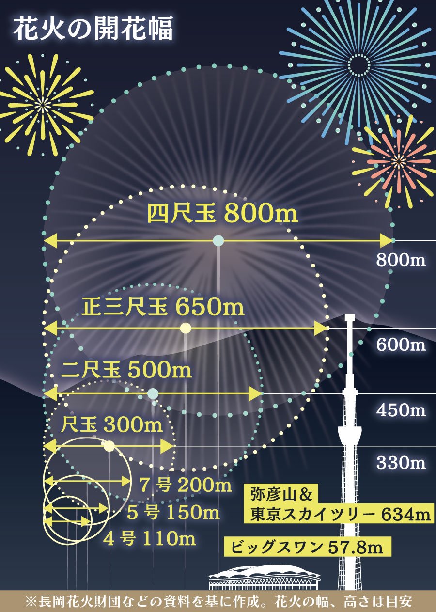 柏崎花火の「尺玉300連発」など多くの花火大会で打ち上がる尺玉(10号)は、高さ約330メートルで花開き、開花幅は約300メートルです。東京タワー(333メートル)の先端付近で「ド〜ン」と開くイメージです。