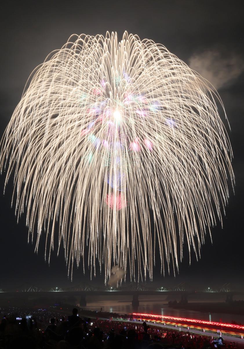 新潟市北区で8月25日に開かれる「阿賀野川ござれや花火」でメーンを飾る二尺玉は、上空約450メートルで花開き、約500メートルの大輪を咲かせます。花火事務局は「雄大な阿賀野川の川幅を生かした花火」と胸を張ります。