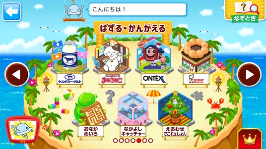アプリ内に複数の企業や団体のパビリオンがあり、商品やサービス、子ども達へのメッセージが知育ゲームの題材として登場。
