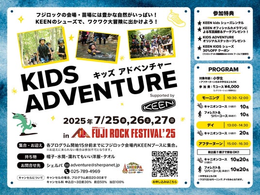 フジロック’25×KEENコラボレーション第6弾『HYPERPORT H2(ハイパーポート エイチツー)』をはじめとした水陸両用サンダルや防水トレッキングシューズなど、フェスでも活躍するアイテムを販売。毎年大好評の小学生を対象にした川遊び・森遊びが体験できるキッズプログラム<KIDS ADVENTURE in FUJI ROCK FESTIVAL>は親子で参加できる時間帯が追加に!また、今年も参加費が全額チャリティーになる参加型ゲームも実施いたします。
