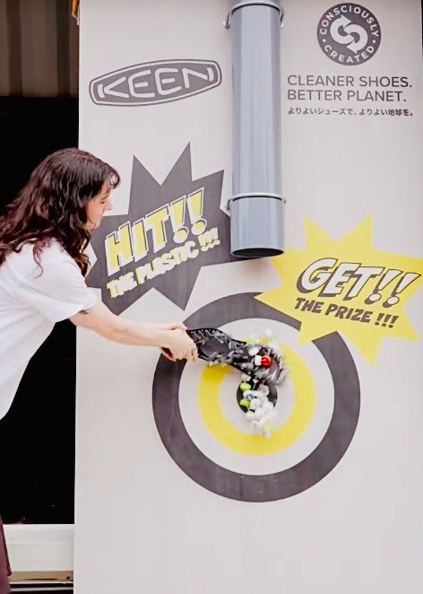 参加費がチャリティーに!参加型ゲーム「HIT THE PLASTIC」上から落ちてくるプラスチックキャップをタイミングよくバッティングするゲーム。参加費500円はKEENの環境保護・社会貢献活動パートナーに全額寄付いたします。