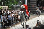 赤色と黄色のほろをまとった射手2人が馬に乗り、8の字に歩く伝統の「千鳥足所作」を披露。参道を駆け抜け、狙いを定めて的を射抜いた。観客は疾走を見守り、矢を放つ姿を撮影していた。
