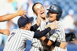 中越ー六日町 8回を三者凡退で抑え、グラブタッチする六日町の主戦・佐藤球士(手前右)=ハードオフ・エコスタジアム