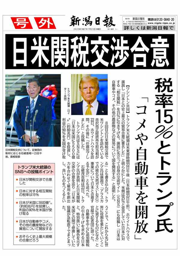 【号外】日米関税交渉合意 2025/7/23 10:20 (最終更新: 2025/7/23 10:24) PDFで号外を見る トップページで最新情報を見る 関連ニュース 【号外】新潟県知事が柏崎刈羽原発再稼働を容認 11/21 【号外】日経平均初の5万円台 10/27 【号外】新首相に高市早苗氏、女性で初めて選出 10/21 【号外】燕市の新市長に前市議の佐野大輔氏 10/20 【号外】北信越高校野球・帝京長岡が優勝 10/19 【号外】公明党が連立政権離脱へ 10/10 【号外】ガザ全人質解放へ 10/9 【号外】ノーベル化学賞に北川進京都大特別教授 10/8 ノーベル化学賞に京都大特別教授の北川進氏ら 10/8 【号外】ノーベル生理学・医学賞に大阪大栄誉教授の坂口志文氏ら3氏 10/6 【号外】自民党新総裁に高市早苗氏 10/4 【号外】石破茂首相が辞任の意向 9/7