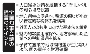 全国知事会は23日、青森市で全国会議を開き、人口減少問題の克服を目指した提言をまとめ、国に対し、対策に取り組む「庁」レベルの行政組織の設置を要求した。医療機関の経営難についても各知事が窮状を訴え、国による早急な対策を求めた。新潟県の花角英世知事は「厳しい経営環境にある病院への緊急支援の補助制度が必要だ」と述べた。
