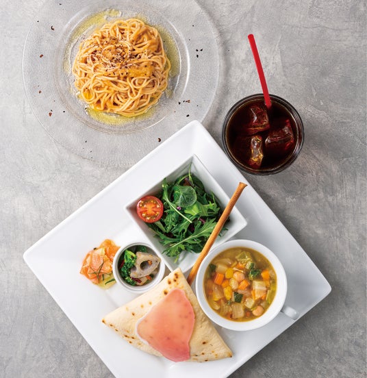 ワンプレートに盛り込んだ前菜5種(有機ベビーリーフのサラダ、本日の前菜2種、本日のスープ、自家製窯焼きパン)、雲丹の冷製スパゲッティ ハーフサイズ、ドリンク