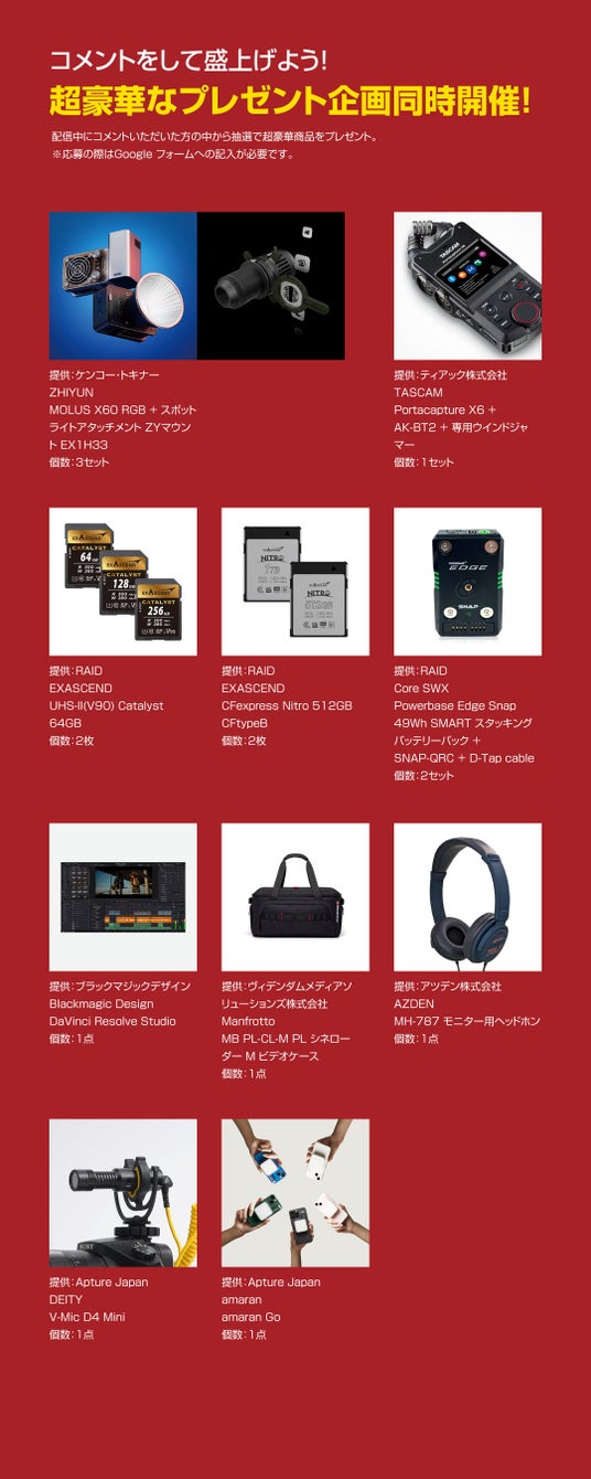各時間帯において、カメラ用機材やガジェットが当たるプレゼント企画も実施します。