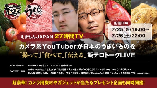 自社ライブコマースチャンネル「うまいものJAPAN」「えまもんJAPAN」も同時ローンチ!7月25日(金)19:00より、27時間ノンストップでYouTubeライブ配信