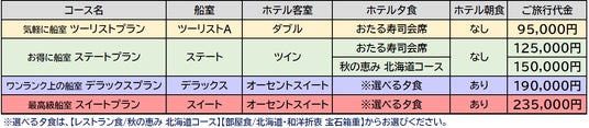 新日本海フェリーでは、お気軽なツーリストAから最高級のスイートまでご希望に合わせて5つのプランからご選択いただけます。