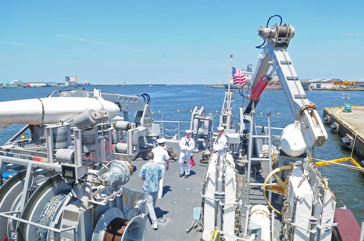 ヴォーゲル大尉の案内で、まず向かったのは船尾の甲板。機雷や機雷除去の方法などが紹介されました。在日米海軍司令部の言語スペシャリスト、ニコラス・ドンリーさんが、分かりやすく翻訳してくれました。