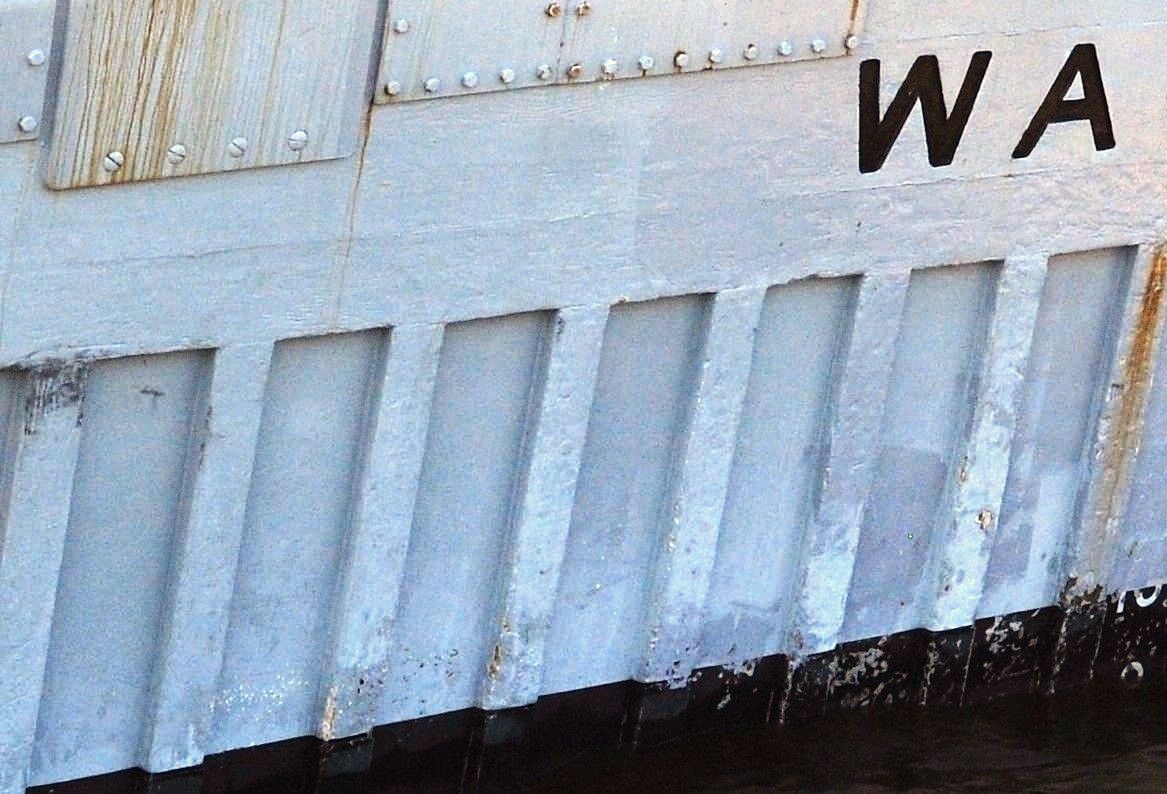 外観からはとても木造とは思えません。一部の外板は強化プラスチックのようなもので覆われているのでしょうか、表面は平らでなめらかです。きれいに塗装されていることもあり、鋼製の船体と見分けはつきません。船尾に回ると、継ぎ目の様子や塗装面の凹凸から木造の雰囲気がわずかにあるように感じられます。