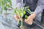 深雪なすの出来を確認する仲丸晋也さん=魚沼市下田