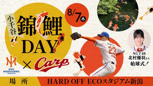 オイシックス新潟アルビレックス・ベースボール・クラブと広島東洋カープの交流戦にて「小千谷錦鯉DAY」が開催されます。プロ野球球場に錦鯉が展示されるのは初めての試みです。