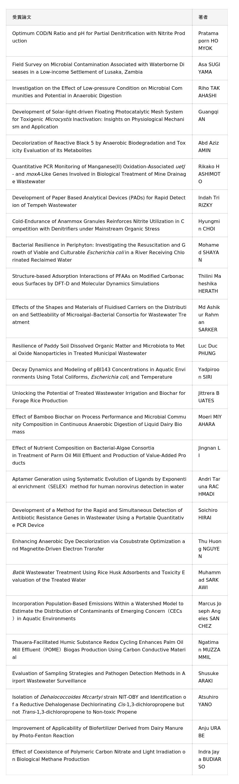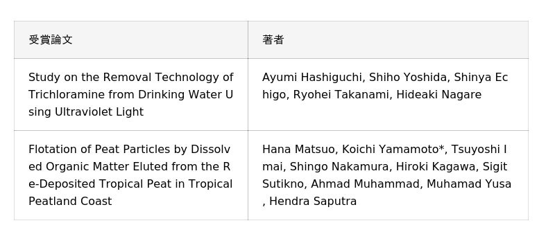 本賞は、日本水環境学会が主催する学術誌「JWET(Journal of Water and Environment Technology)」に掲載された優秀な論文に対して贈られる「Excellent Paper Award」と、WET Conferenceでの優れたプレゼンテーションに対して贈られる「Excellent Presentation Award」の2部門で構成されています。