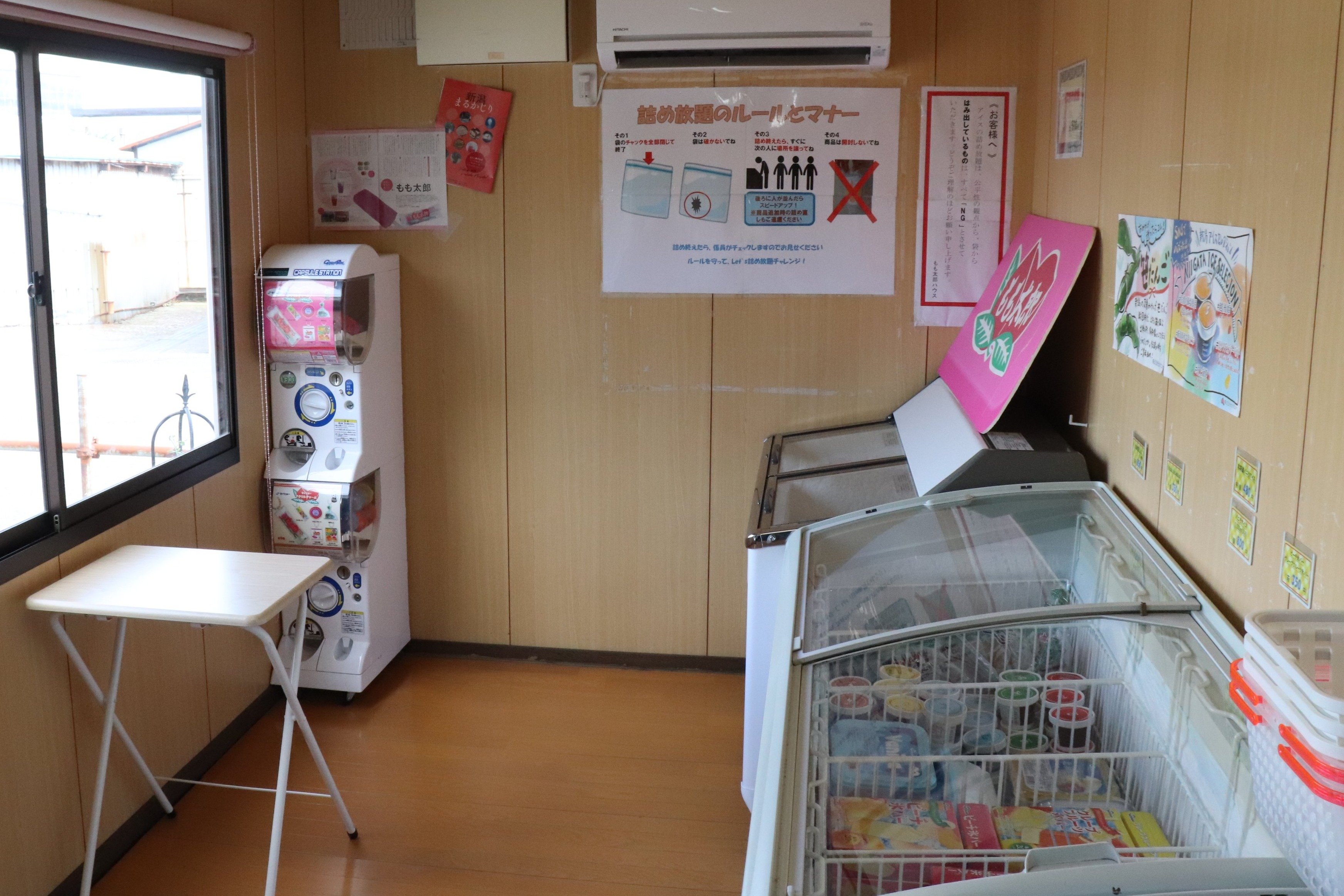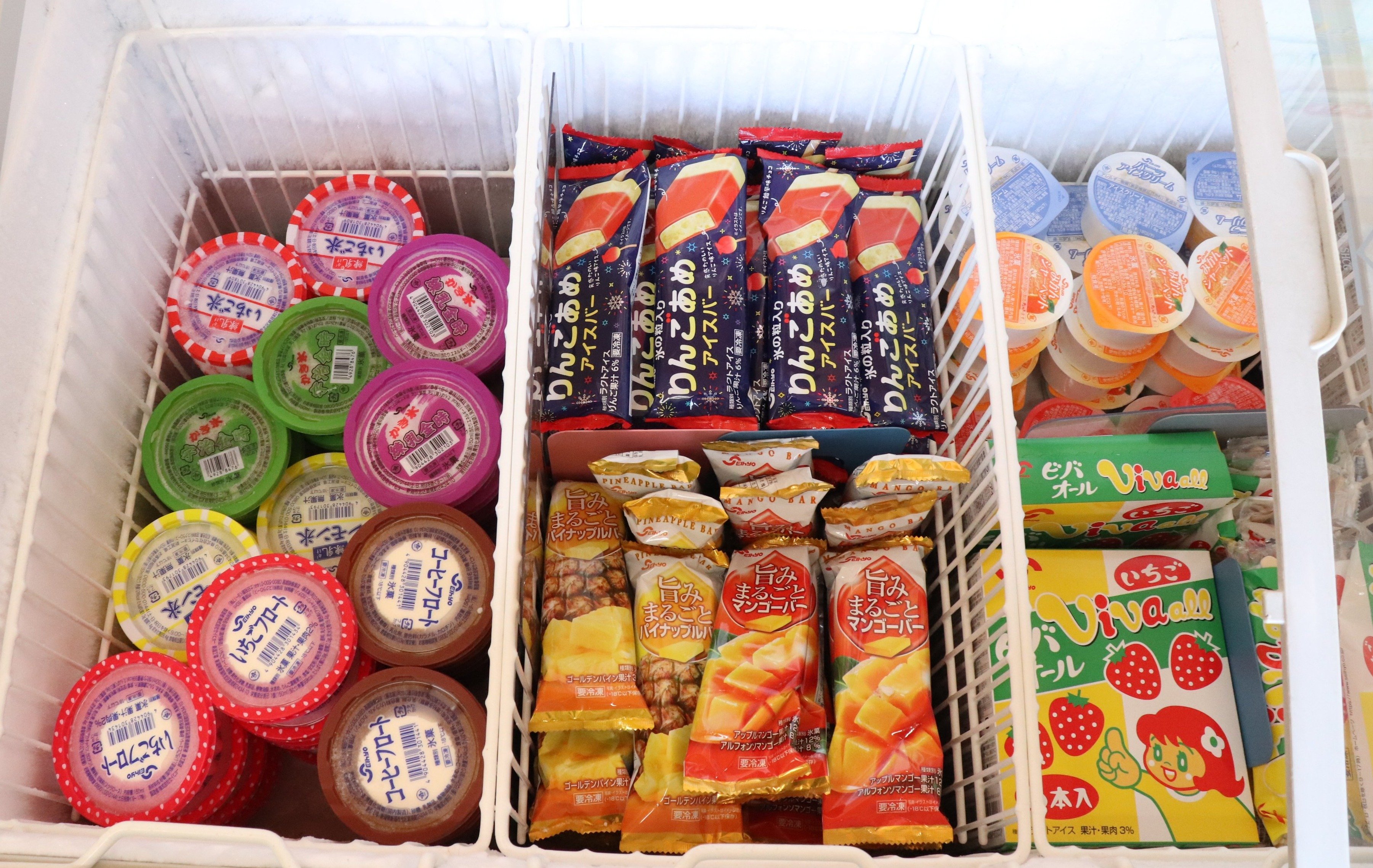 おおっ、なかなかシンプルなつくり。壁に沿ってアイスのショーケースがあり、隅にはカプセルトイの販売機が置いてあります。奥が詰め放題で、手前は普通の販売用です。まずは手前から。ショーケースをのぞくと当たり前ですが、アイスがぎっしり。
