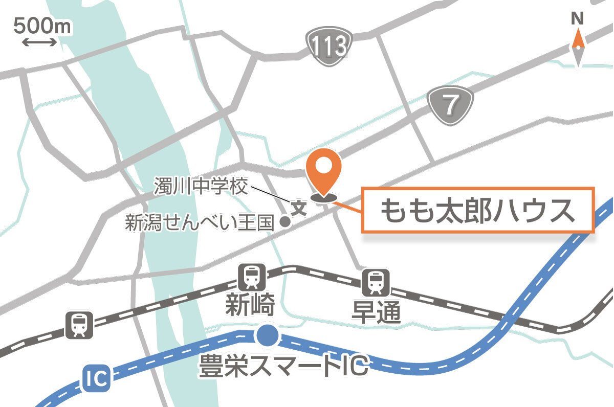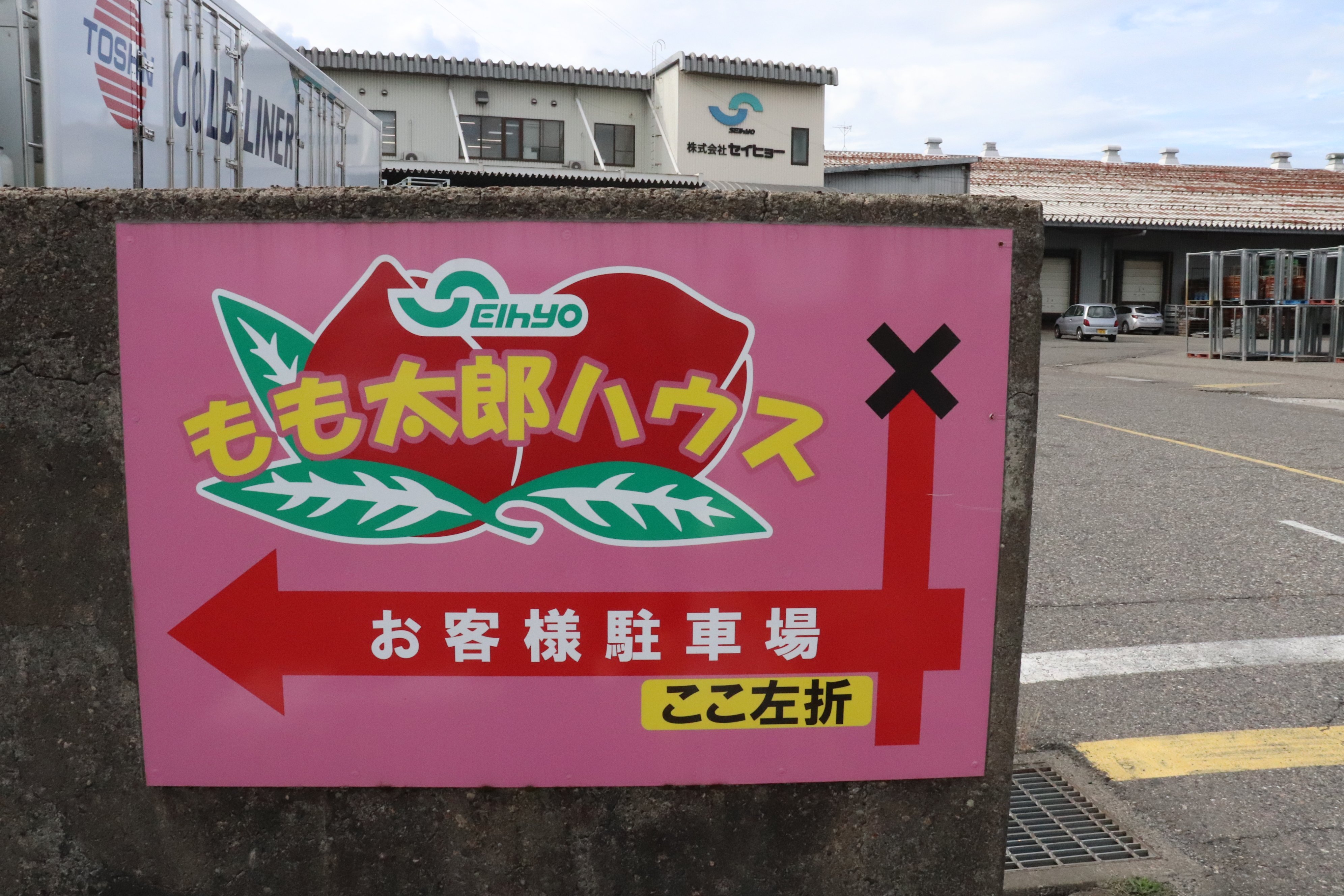 いざ「もも太郎ハウス!」ということで、「もも太郎ハウス」のあるセイヒョー豊栄工場(新潟市北区)に向かいました。工場のある敷地の一角に「もも太郎ハウス」の看板を掲げた建物を発見!独特のピンク色に心が躍ります。