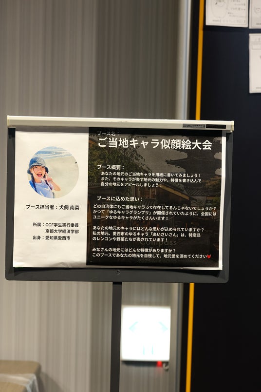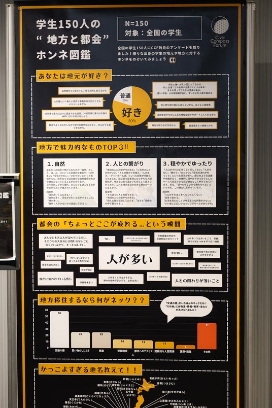 開会前の会場では、学生実行委員による展示ブースが設けられました。これらの展示は地方に対するアンケート結果のほか、似顔絵や偏見イメージなど学生らしいクリエイティブな展示となり、来場者は開演を待ちながら地域の魅力を体感しました。