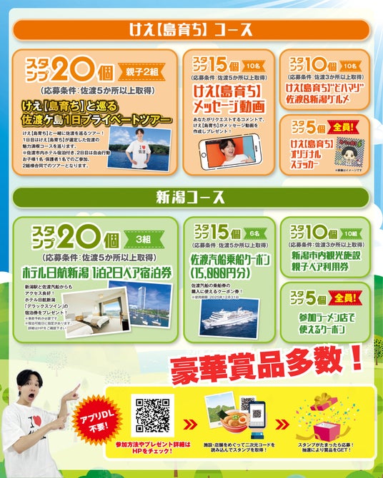 さらに賞品には“けえ【島育ち】コース”をご用意。スタンプを20個集めるとけえ【島育ち】と巡る佐渡ヶ島1日プライベートツアーに応募できます!