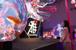 雰囲気を盛り上げる水音などの音響もオリジナルといい、新潟らしく花火の音も流れます。壁面の水槽の背景は、トキや花火の映像が映され、”新潟感”満載です。