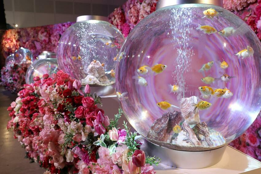華やかな花壁に展示された金魚たちと、花束を手に撮影できるコーナーも。花々が咲き乱れる世界に、金魚たちと迷い込んだような不思議な写真が撮れます。