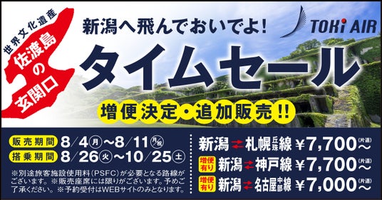 新潟拠点の地域航空会社トキエア株式会社(本社:新潟県新潟市 代表取締役:長谷川政樹、和田直希 以下トキエア)は、2025年8月4日(月)12:00~8月11日(月/祝)23:59でタイムセールを実施することをお知らせいたします。なお、今回のタイムセールでは、2025年8月26日(火)~10月25日(土)に運航する便を対象としています。