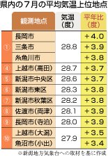 新潟地方気象台によると、新潟県の7月の平均気温は平年より長岡市で4・0度高い28・8度になるなど、全28地点で観測史上最高だった。気象台は、この先も1カ月程度は平年に比べて気温が高い見込みとし、農作物や家畜、水の管理、熱中症対策などの健康管理に注意を呼びかけている。