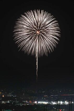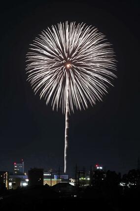 1945年の長岡空襲から、1日で80年を迎えた。長岡市では空襲が始まった午後10時半に合わせ、犠牲者を慰霊する花火「白菊」3発が打ち上げられた。市民らは白い大輪を見上げ、戦争で犠牲になった人々に改めて祈りをささげた。