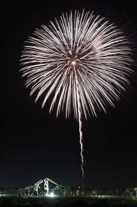 白菊は長岡市の花火師、故嘉瀬誠次さんが、シベリアで犠牲になった戦友のために始めた慰霊の花火。2003年から長岡空襲の時刻に合わせ、信濃川河川敷で打ち上げられている。今年も白一色の花火が1発ずつゆっくりと広がり、夜空を照らした。