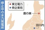 貯水率が低下した大谷内ダムを視察する小泉進次郎農相(左)=3日、津南町
